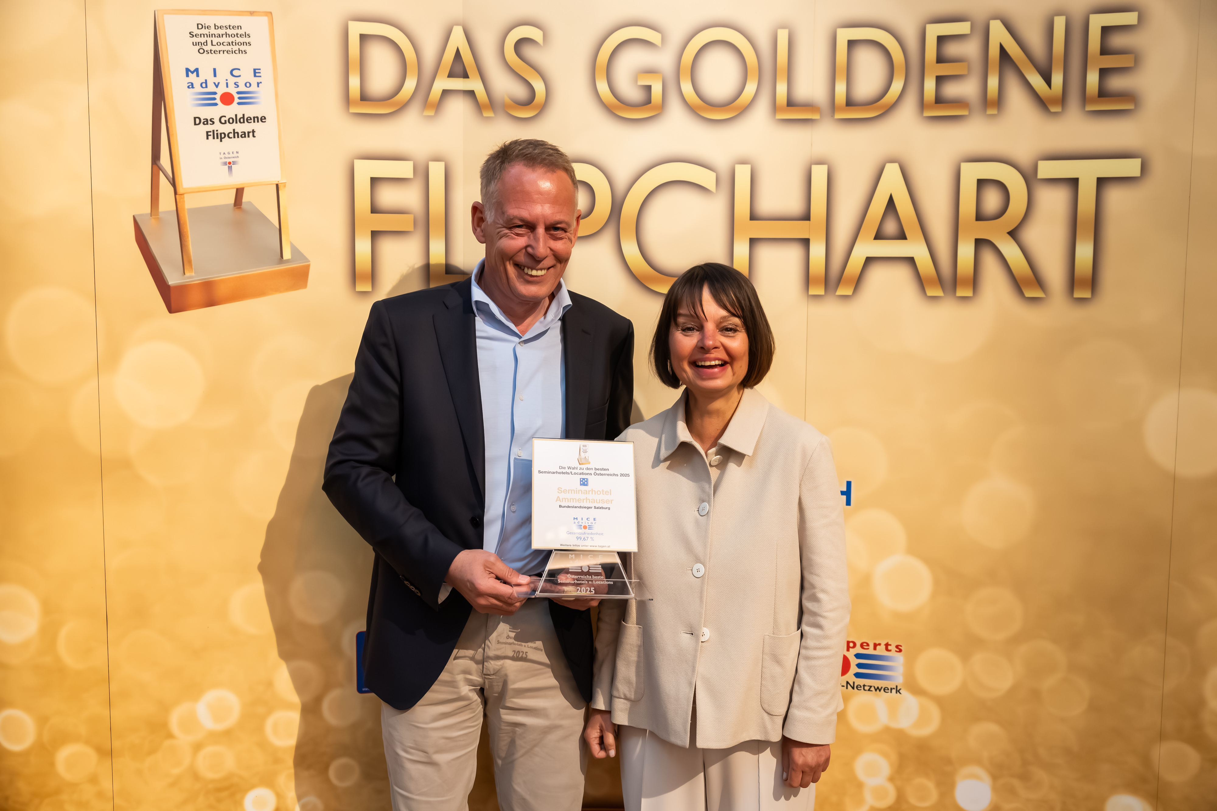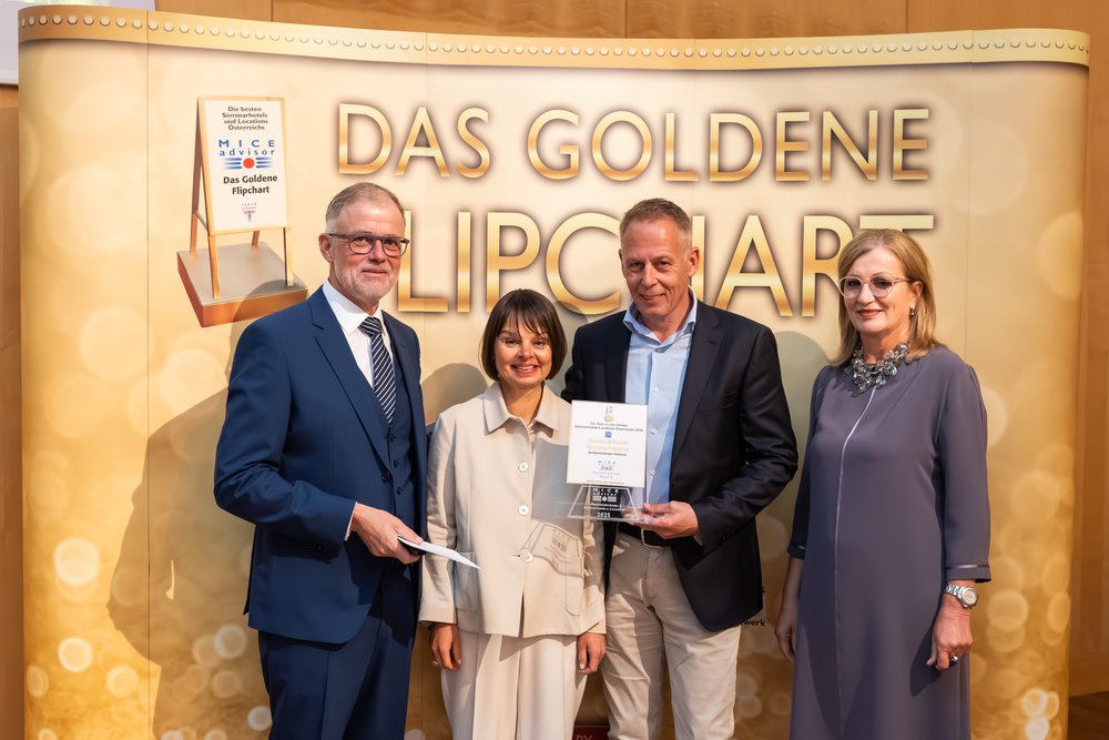 Mit einer Gesamtzufriedenheit von herausragenden 99,67 % wurden wir bei der diesjährigen Verleihung der Goldenen Flipcharts 2025 ausgezeichnet. Bereits zum 19. Mal durften wir den Titel als bestes Seminarhotel Salzburgs entgegennehmen – ein großartiger Beweis für unsere konsequente Qualität, persönliche Betreuung und das besondere Ambiente, das unsere Gäste so schätzen.